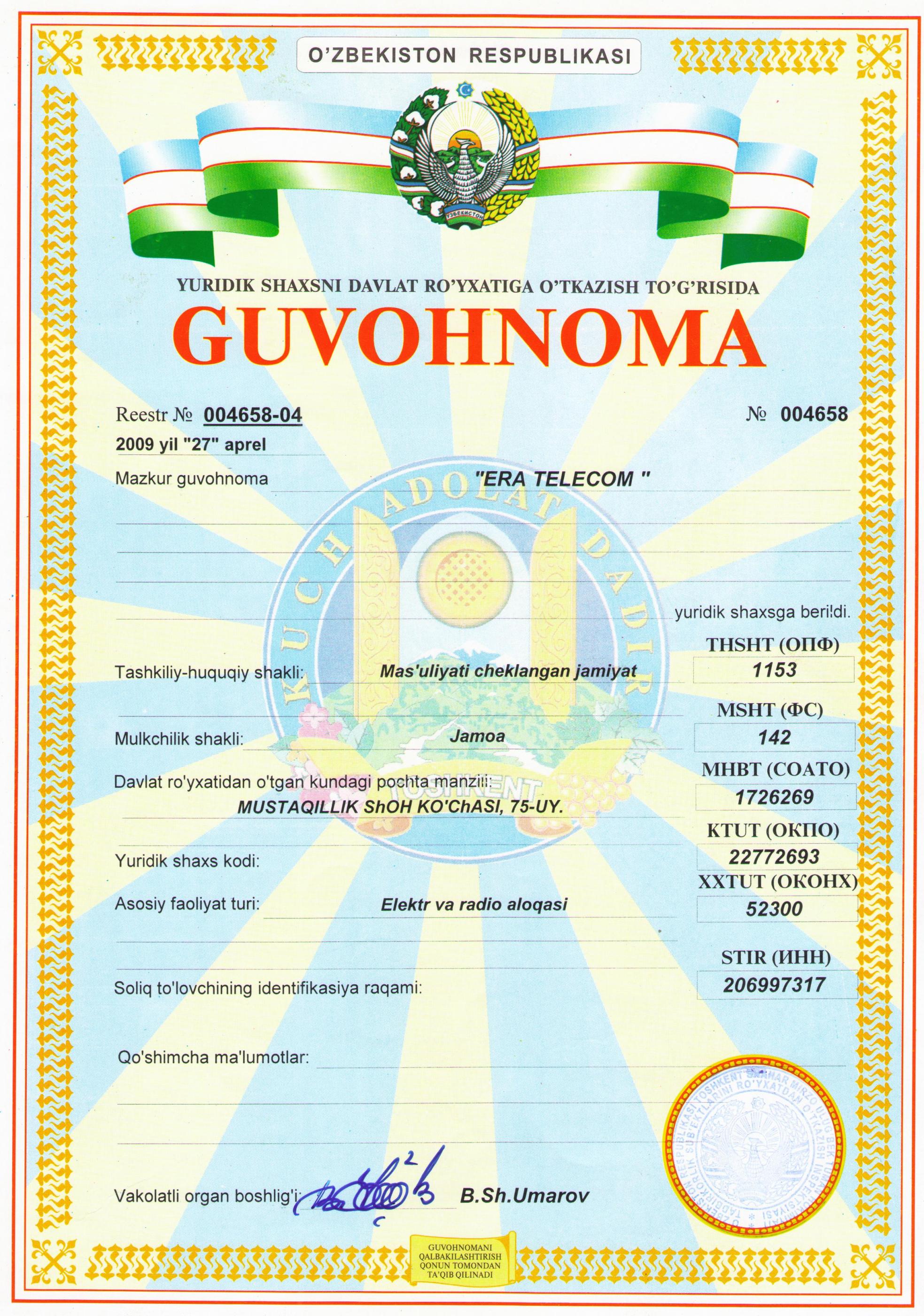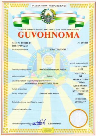 ООО "Эра-Телеком" имеет следующие лицензии Узбекского Агентства по связи и информатизации: №0003001 - Проектирование, строительство и эксплуатация сетей передачи данных.